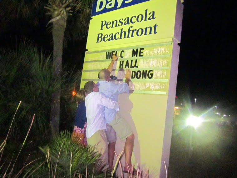 Made me giggle thinking of my brother's wedding week when we oh-so-soberly and maturely changed the letters on the hotel's welcome sign while walking home from the bar :)